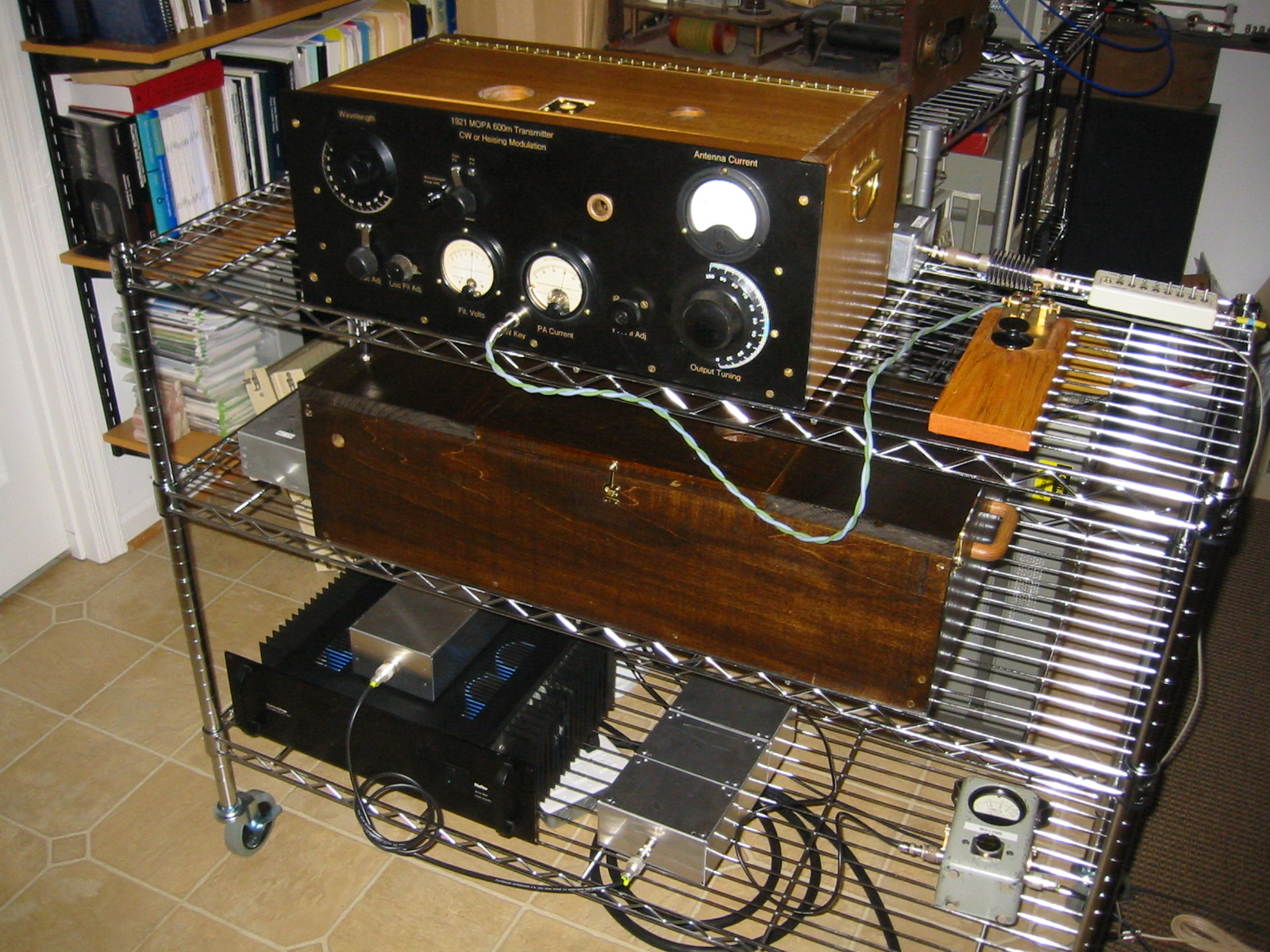 This picture shows top to bottom: MOPA Exciter MOPA Power supply of death! <--- as my wife calls it. (But it's only 700VDC) Hafler 9505 amp with balun box on top of it Right of that is W1VD style LPF then Bird wattmeter. Tuner not shown is across the room on the operating desk Not also shown is 12" fan behind Hafler amp to keep it cool.