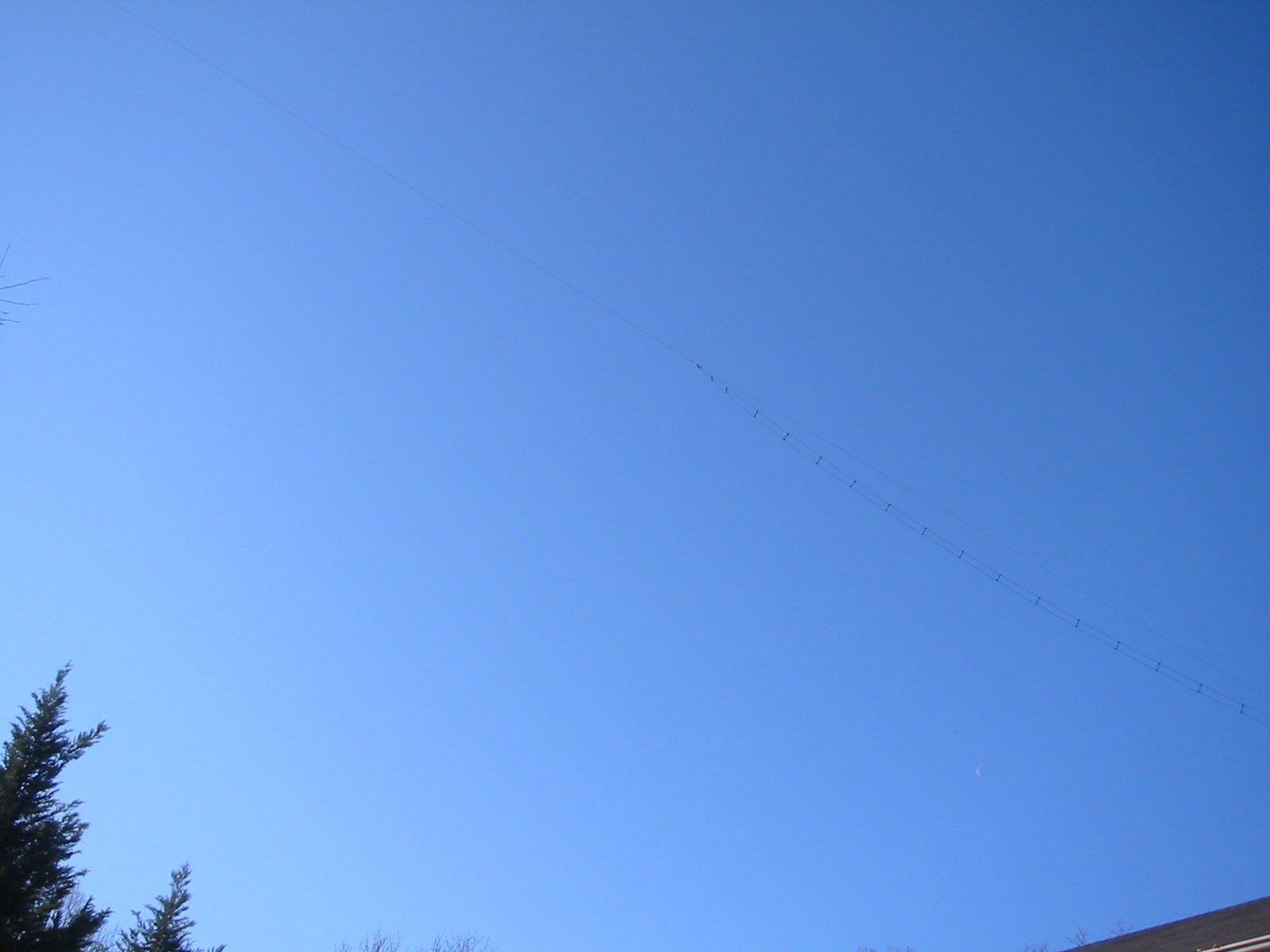 160m dipole with 4 inch ladder line feed going to switch box and balun and loading coil on side of house.