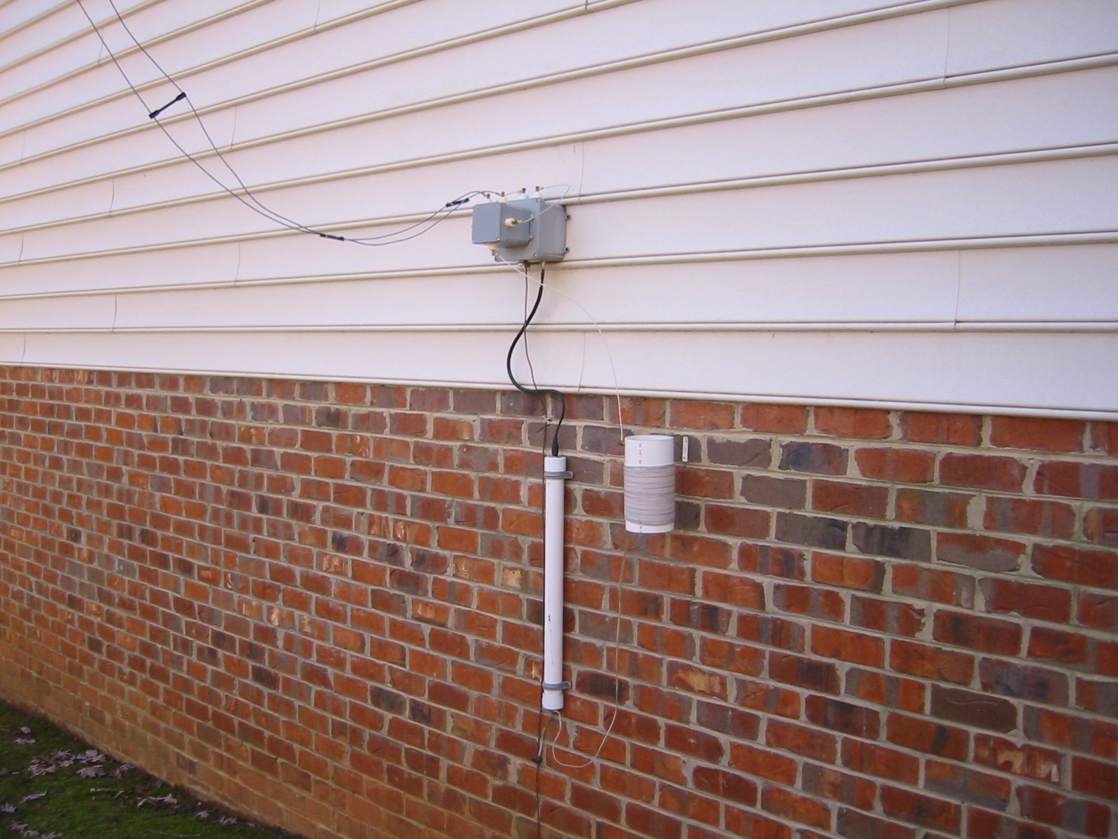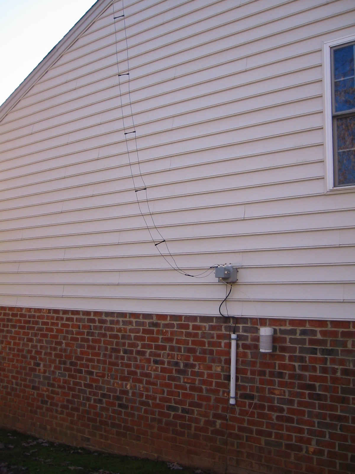 The switch box and balun and loading coil on side of house. Switch box allows me to switch open wire feed to HF 4:1 current balun in grey box. Can fast switch from 600m to HF with open contact relay in small grey box. Long white tube is 4:1 current balun for 600m. Large white tube is PVC loading coil. #8 copper wire runs down side of brickwork to network of ground wires and 8ft ground rods to keep worms & grubs from freezing! Hi...hi...